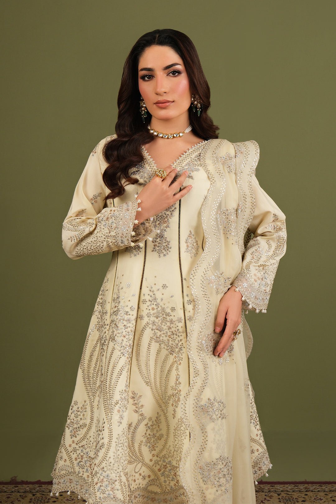 An embroidered silk front executed with refined front-kali construction creates a fluid yet composed silhouette. Raw silk sleeves finished with intricate embroidered borders, introduce depth and textural contrast, while embroidered raw silk trousers complete the look with a polished, artisanal finish.