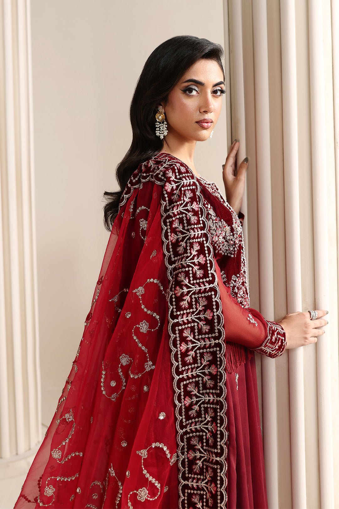 A deep crimson red ensemble featuring a hand-embellished velvet front left yoke with detailed embroidery and handmade work. The embroidered chiffon front, back, and sleeves pair elegantly with a dyed Russian silk trouser, while the flared long silhouette is completed with an embroidered chiffon dupatta finished with a velvet border.